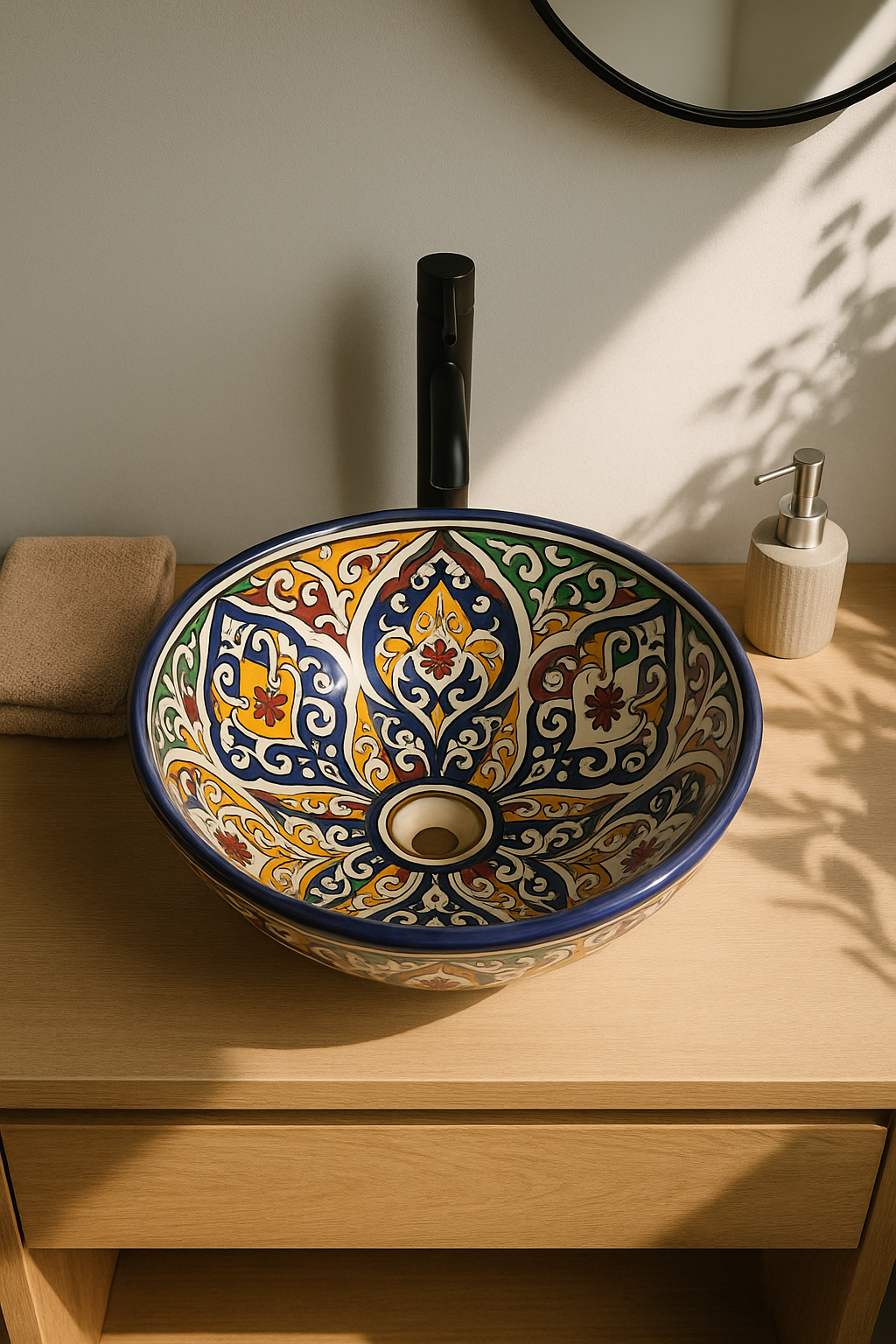 Handgefertigtes Keramikwaschbecken mit traditioneller Dekoration – jedes Stück ist ein Unikat und vereint zeitlose Kunstfertigkeit.