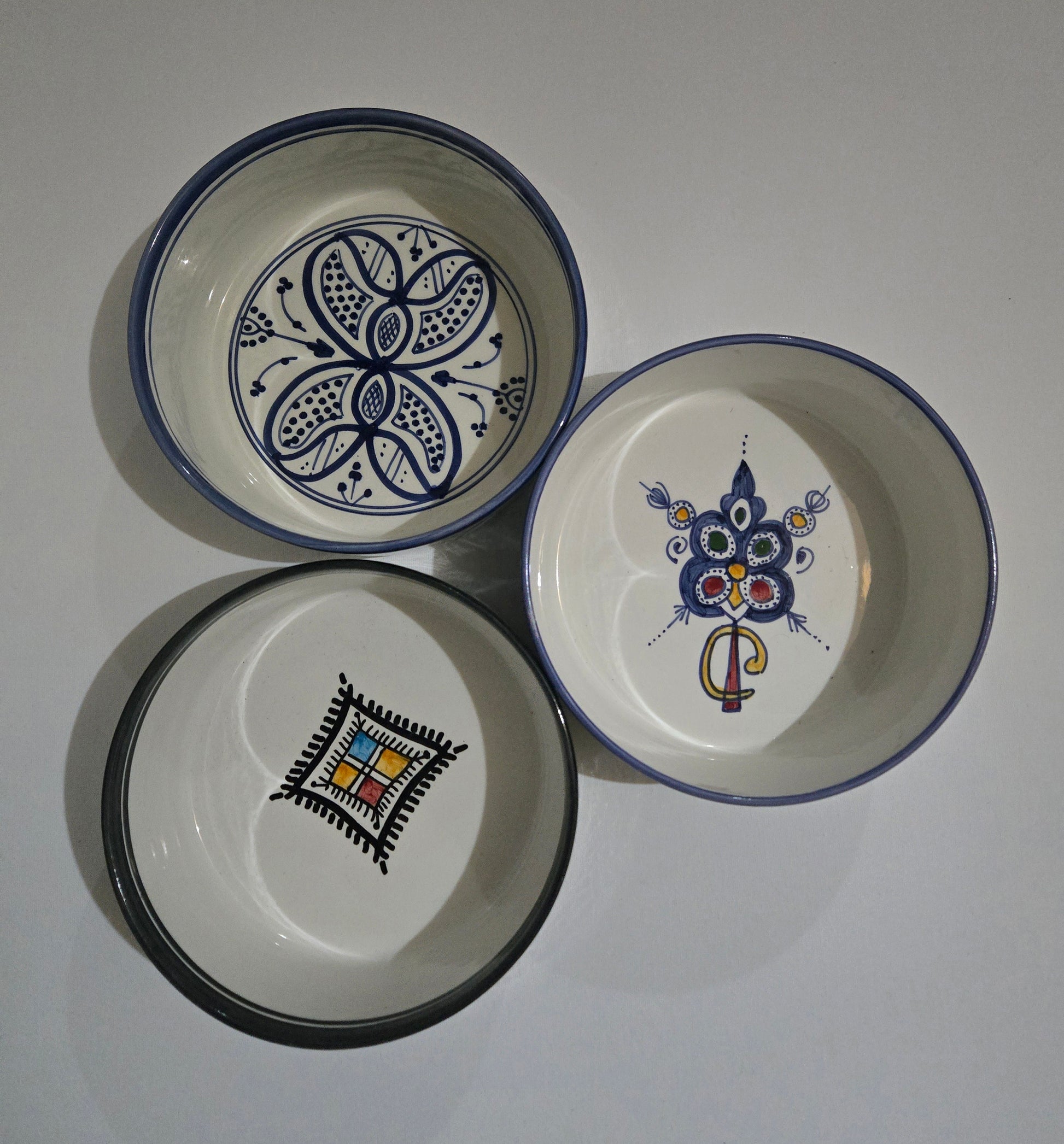 Eine handgefertigte weiße Keramik-Salatschüssel aus natürlichen, lebensmittelechten Materialien. Jedes Stück ist mit traditionellen Mustern und natürlichen Pigmenten verziert, was es einzigartig und umweltfreundlich macht.