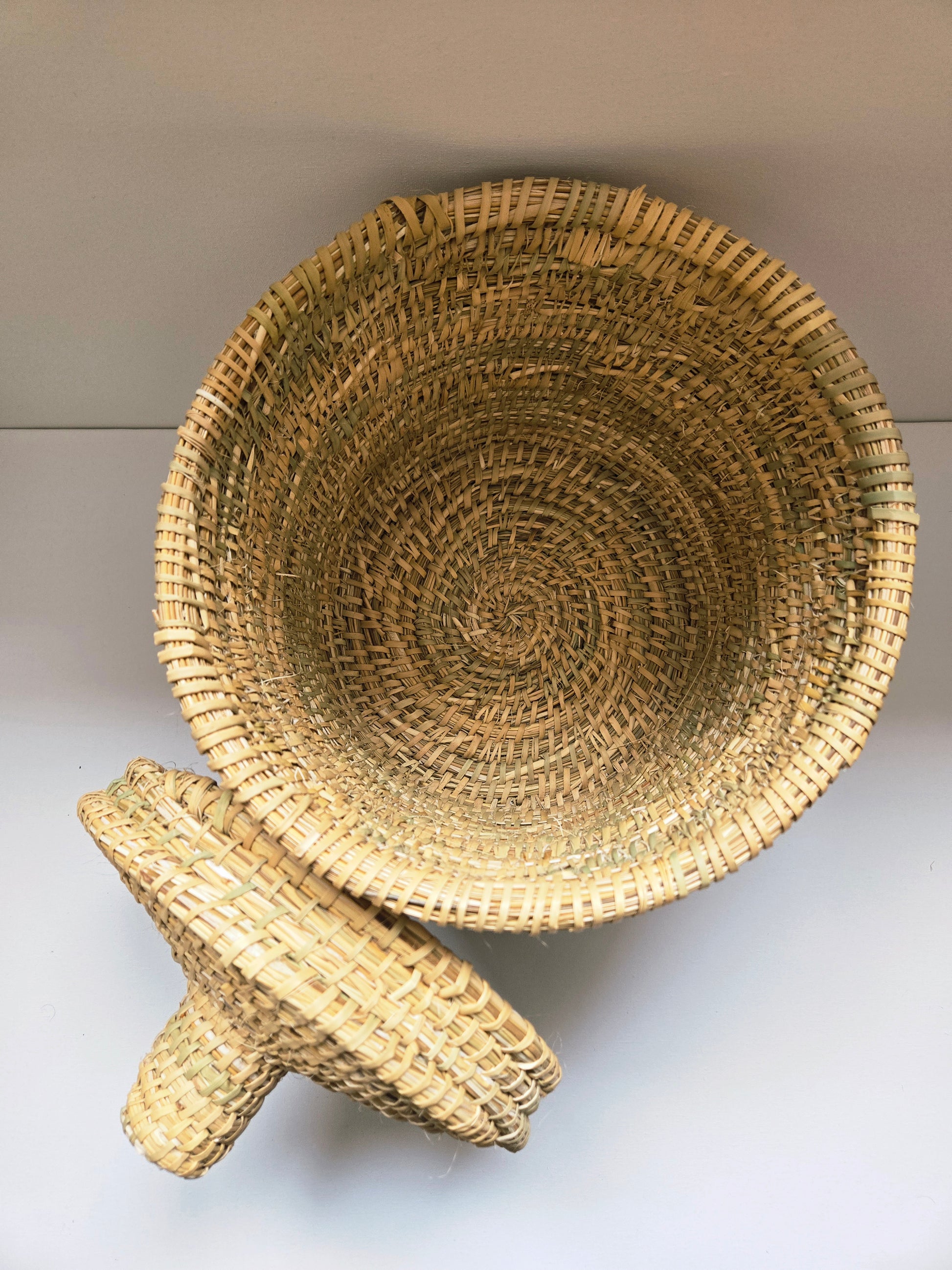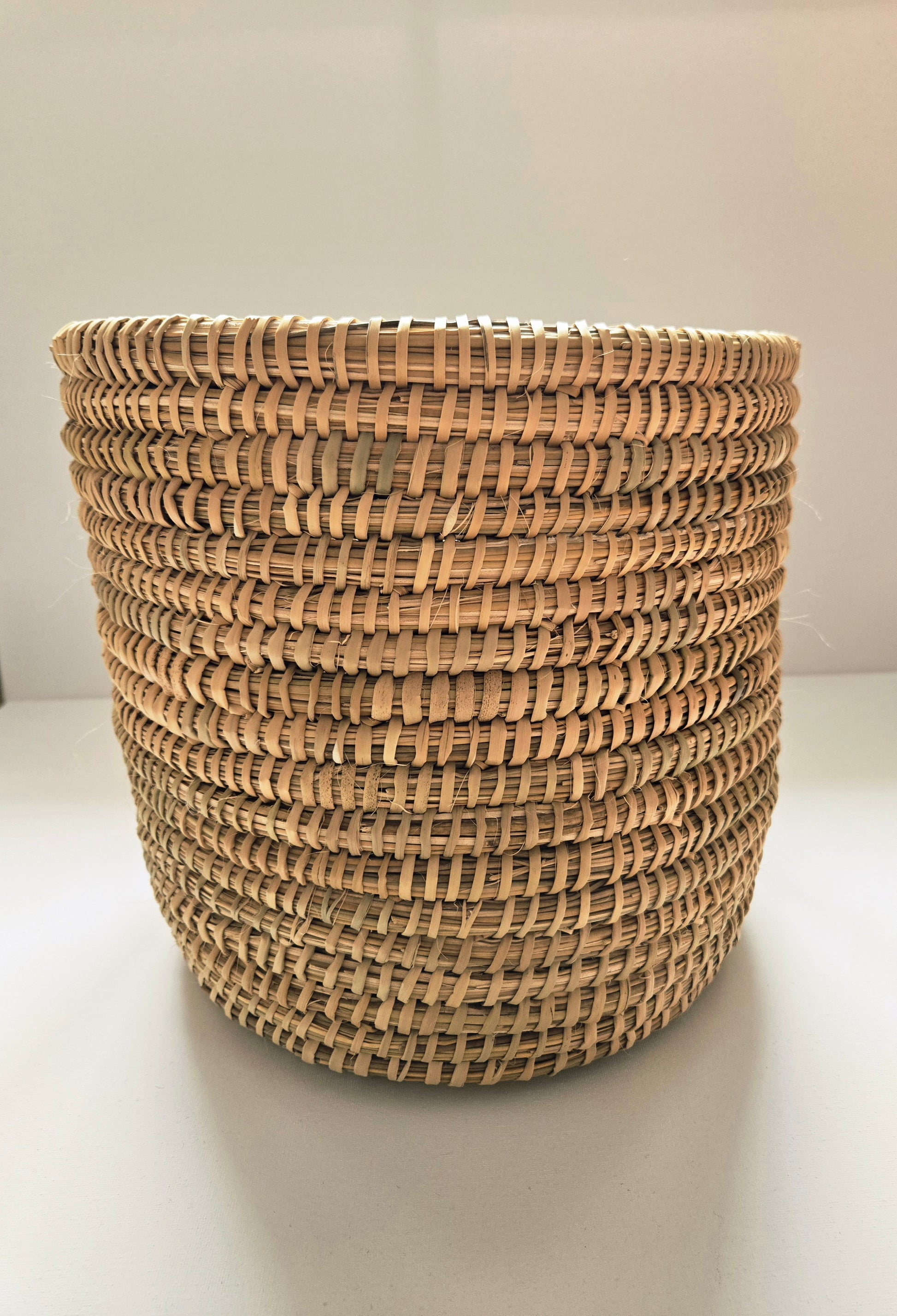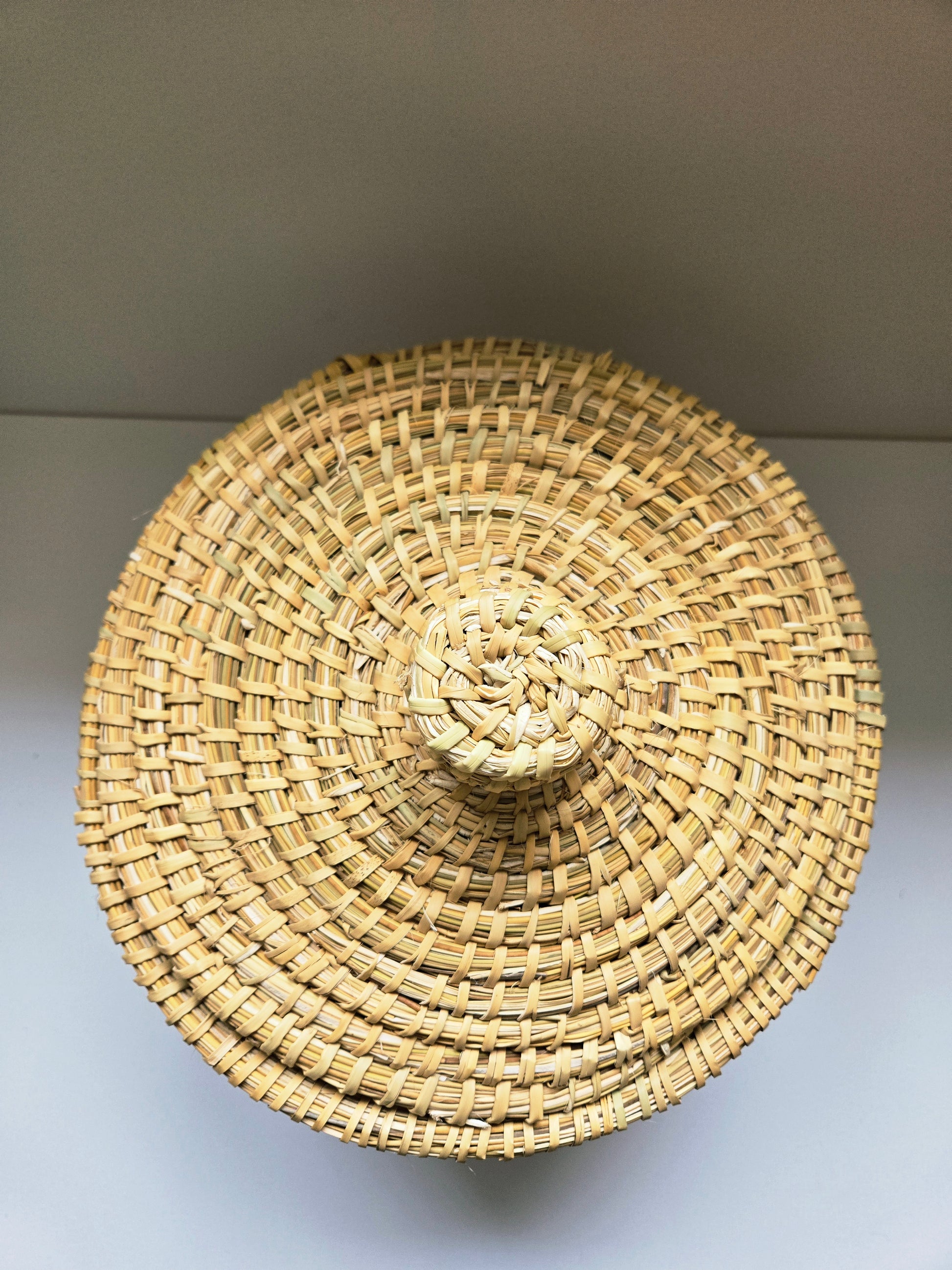Ein handgefertigter Palmblattkorb aus natürlichen Materialien. Jedes Stück ist mit traditionellen Mustern und natürlichen Pigmenten verziert, was es einzigartig und umweltfreundlich macht.